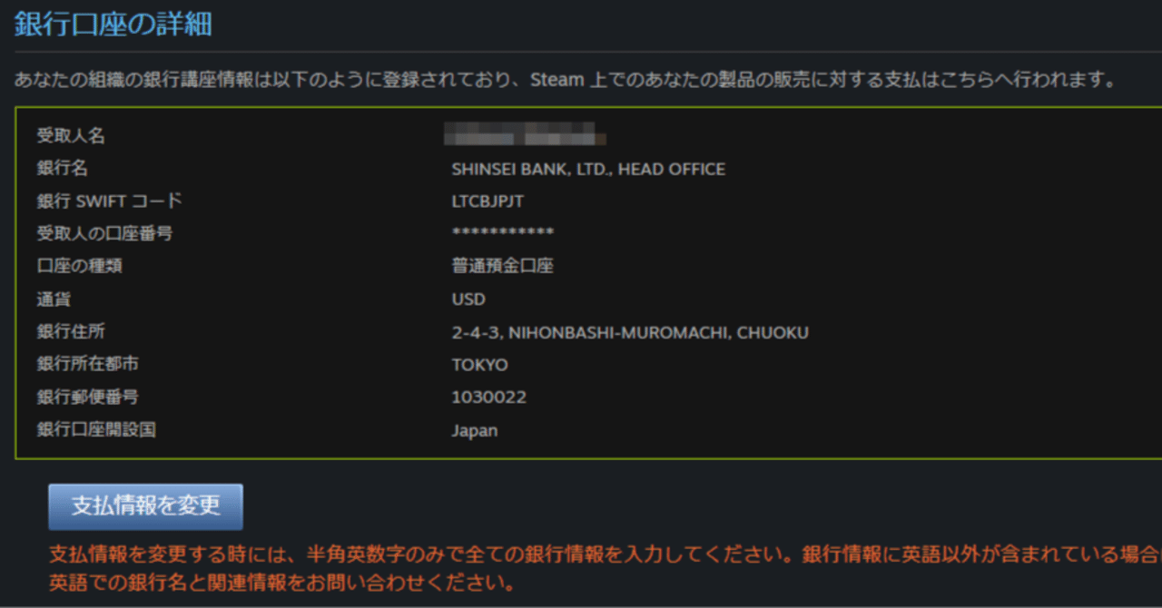 Steamに登録する時に報酬の振り込み口座を登録するのですが、この口座は外貨受け取りが出来る口座じゃないと駄目なんです。 当初私はどんな銀行でも良いと思っていてペイペイ銀行で登録していたのですが、最初の報酬の支払いの時に入金に失敗したとメー...