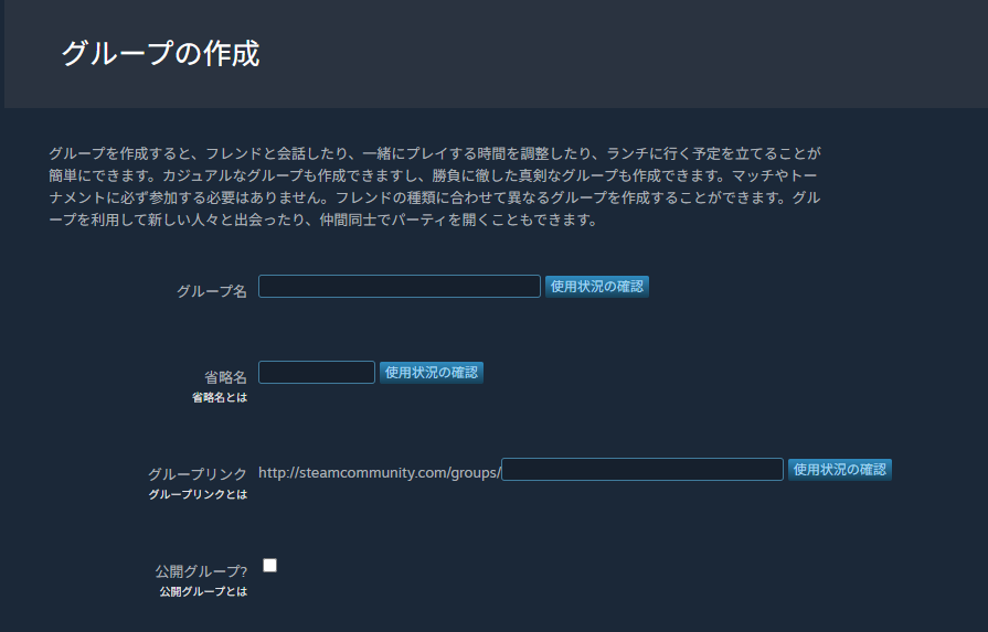まずはグループを作成します。これはキュレーターページとしても利用可能です。言い換えると、STEAM内ではキュレーター、クリエイター、キュレータを区別していません。一番上にグループという概念があり、その中身を変えることで、上記3区分として利用可能になります。